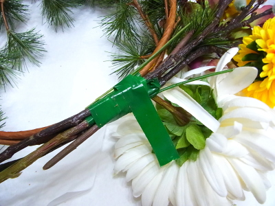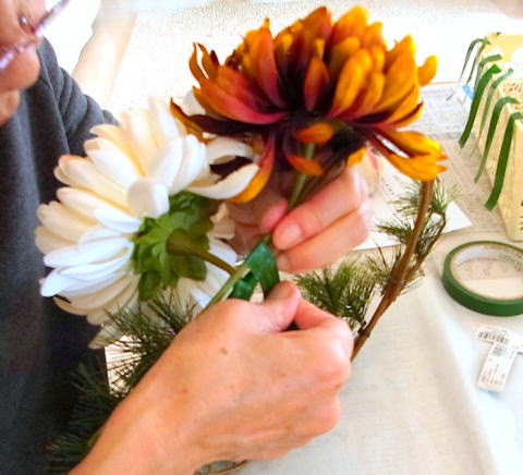 見えてしまう場所はワイヤーで固定しましょう。固定してからぐっと角度をつけて起こします。おなじようにもう一つの大輪のマムも好きな位置にとめつけて、起こしましょう。