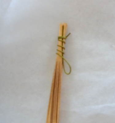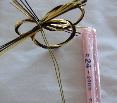 (4) 水引の両サイドをワイヤーで縛り、好きな形にして入れ込んでグルーでとめます。松が浮いたり、ラインを固定したい部分はその都度ワイヤーで固定します。