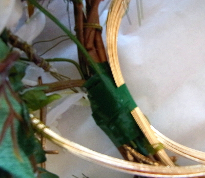 テープは便利ですが、留めるときは一か所~2か所にまとめて、飾ったとき見えないようにしましょう。他はワイヤーでとめますゴールドプランツやローズヒップも茎を 背面から添えてワイヤーやテープでとめて松をかきわけて前に出します。