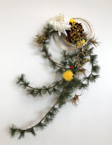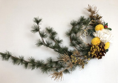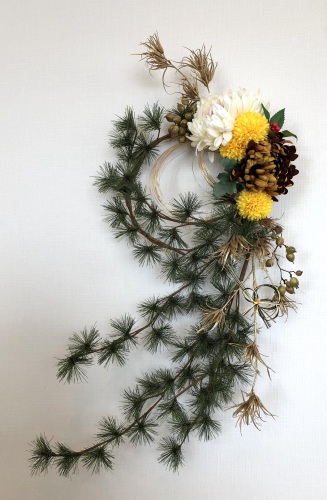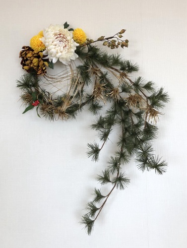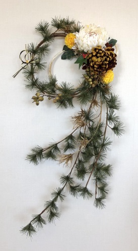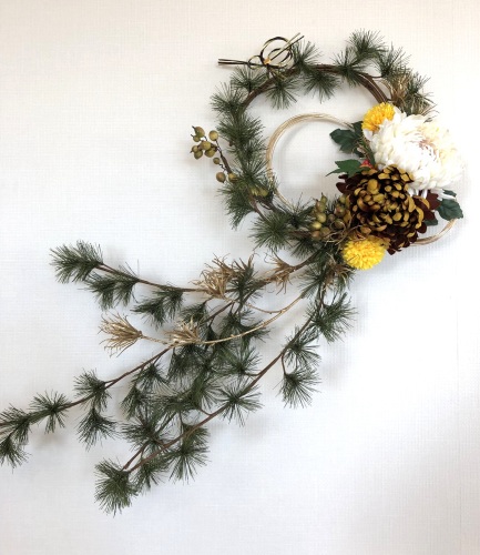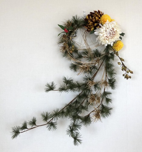 しめ縄はすっかり定番ですが、こうして松でリースのようにつくると、しめ縄とおなじような雰囲気もありながら、グリーンのフレッシュ感も楽しめるデザインになりますね。