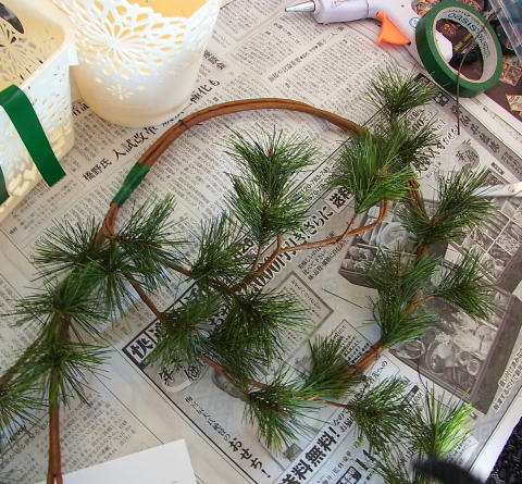 下がっている松から隠すのに必要な長さを一部カットしてのせてとめて素地を隠します