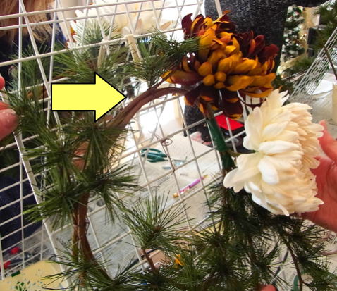 どの松をカットするかは全体をみて決めましょう黄色のピンポンマムもテープでまきとめます。