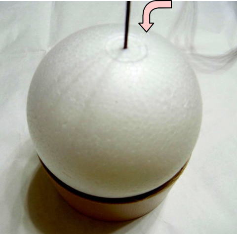 (1) 素ボールに太いワイヤーをまっすぐ貫通させます。下に突き出たら一センチほどUに折り曲げて引き上げ素ボールに挿します。上は持ち手2~3センチほどにカット、おりまげ輪をつくり、あとでリボンを通します。見失ってしまうので、仮のひもなどをとおしておきます。