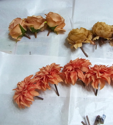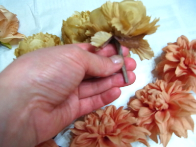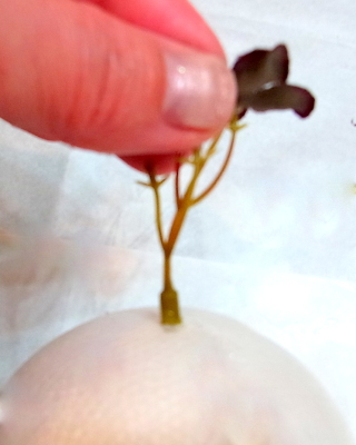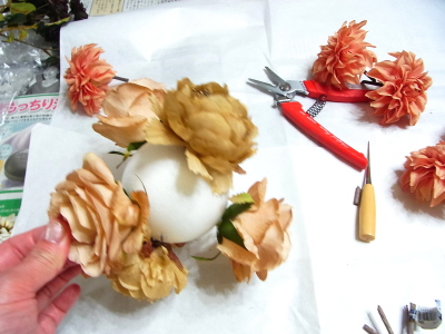 ぱらぱらとお花がおちてしまったら、左の写真のようにUピンで軸をつくって グルーで固定、素ボールにボンドで挿します
