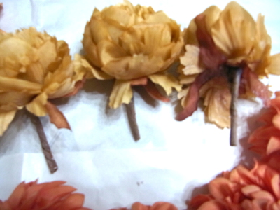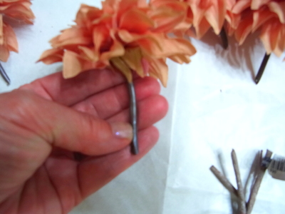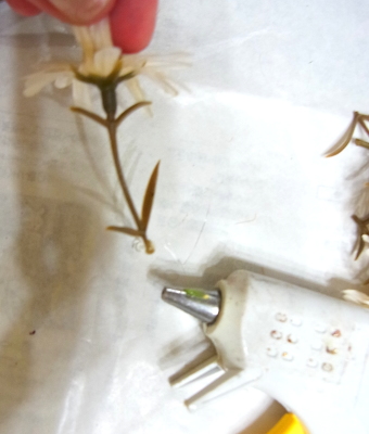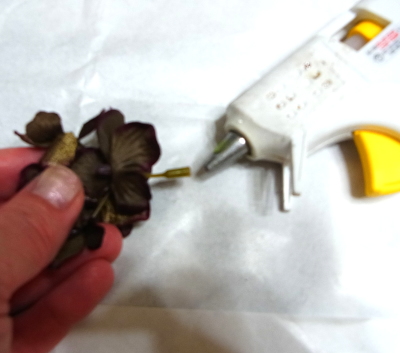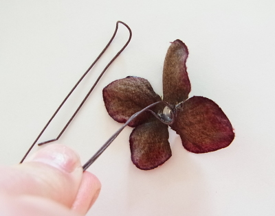 少し気持ちグルーをつけておきましょう。反対側は残ったワイヤーを2.5センチほどにカットして、丸めます、吊り下げるフックになります。 お花の準備をしましょう