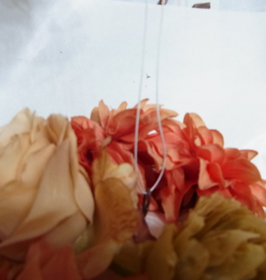 お花がたくさんになると、途中で見失ってしまうので。バラを額のしたまでしっかり、全部挿し込みます。 場所は東西南北の位置でも、どこでも御好きな位置でOK