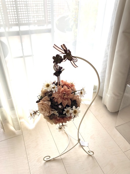今回は球体なので、さすがに、そんなに違いはがでませんね~。紫陽花でとても引き締まってみえます。残った花材は、白いフレームスタンドににはりつけてみてたり、花束にして添えても素敵です
