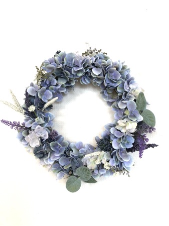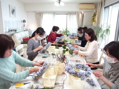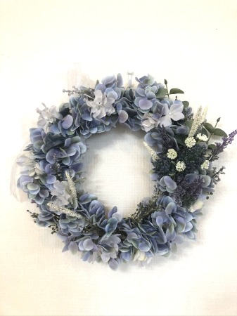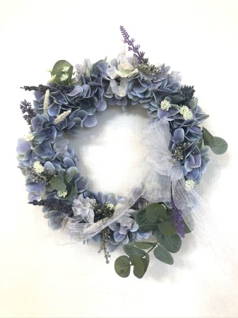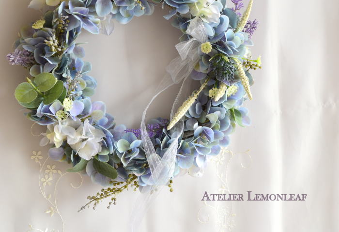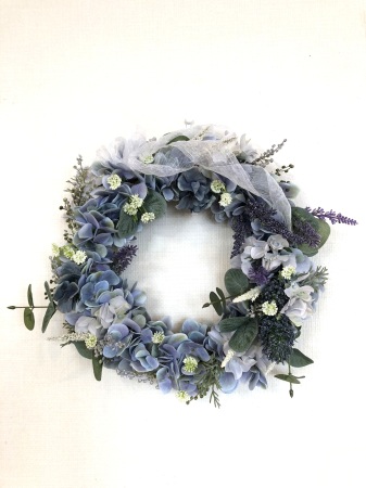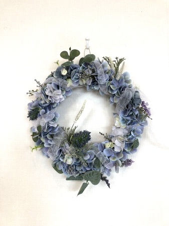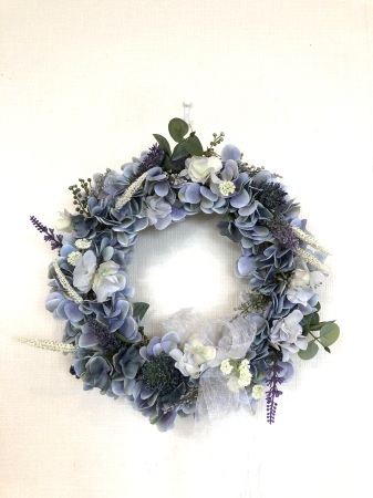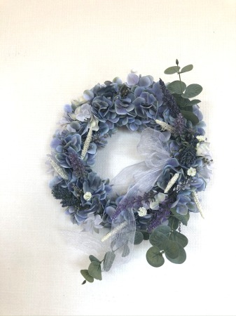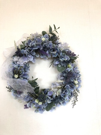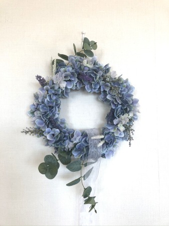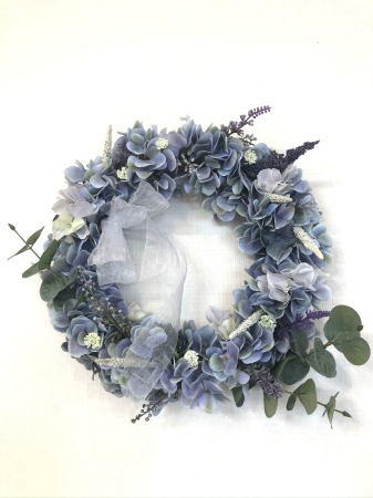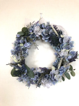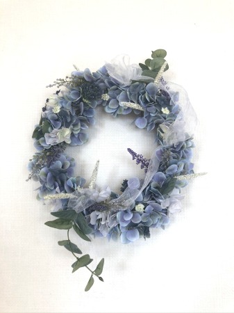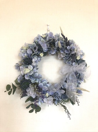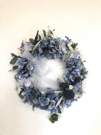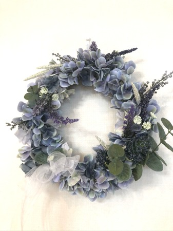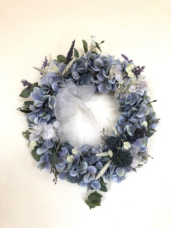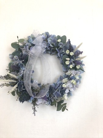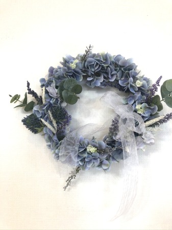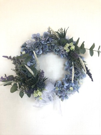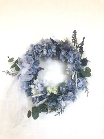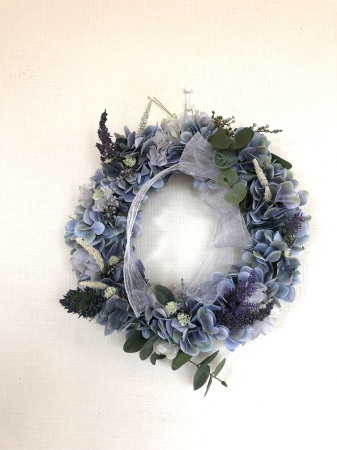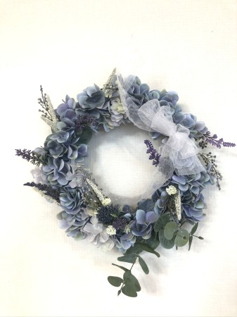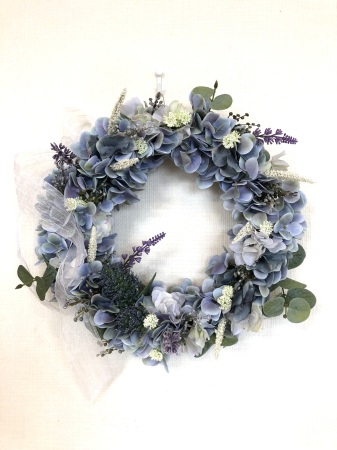 花材:アジサイ三種 ラベンダー、レースフラワー、 ユーカリ