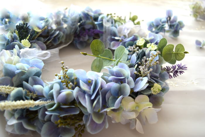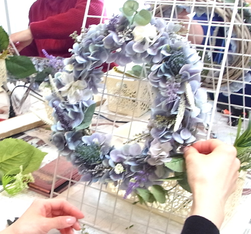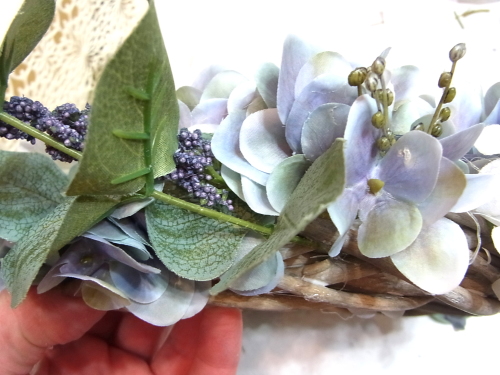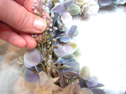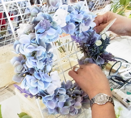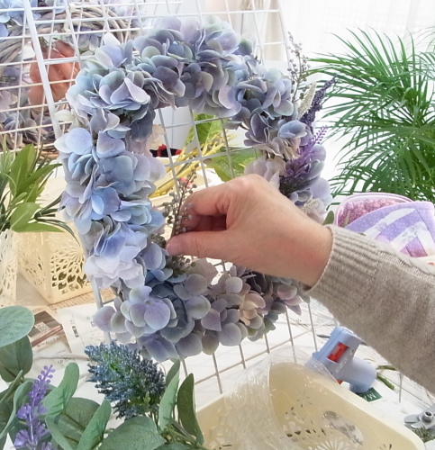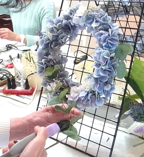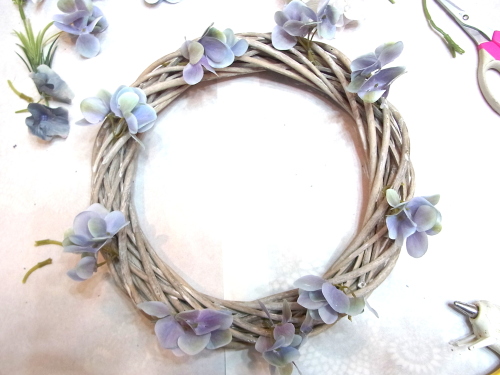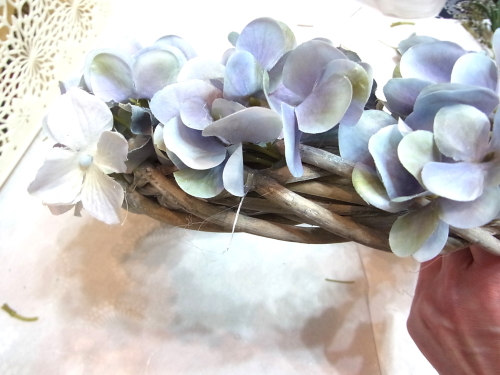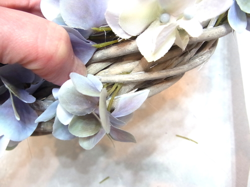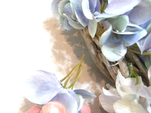 カットしたアジサイを内側につけていきます。この時、内側を全部覆うのではなくて、リースベースの素地もみせることがポイントです。
