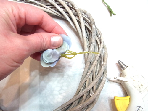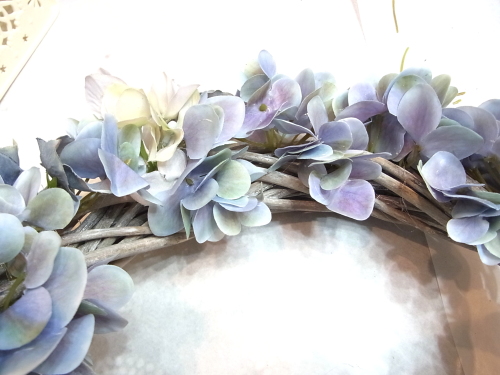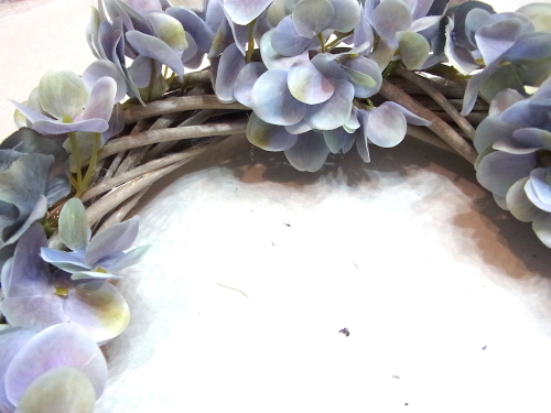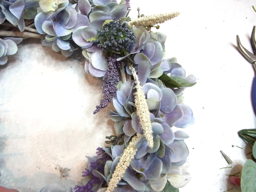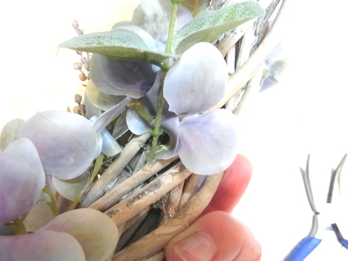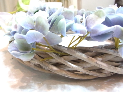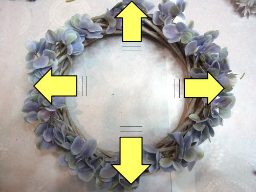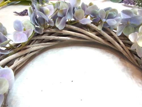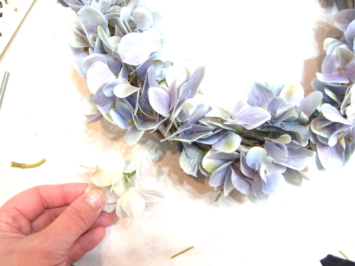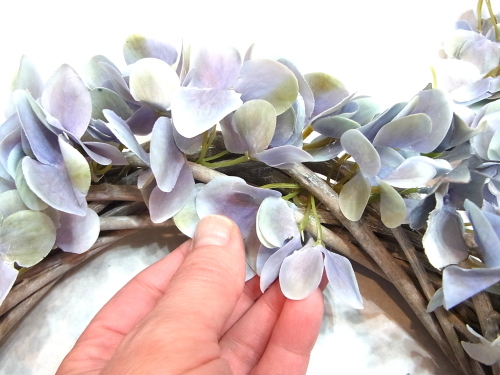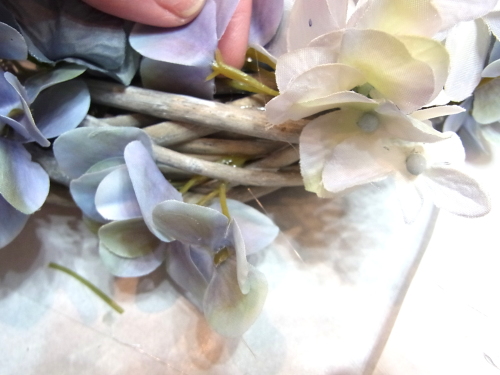 正面用の紫陽花1本はやや長く持ち手2センチくらいにカット。均等にリースの正面にぜんぶつけまましょう。