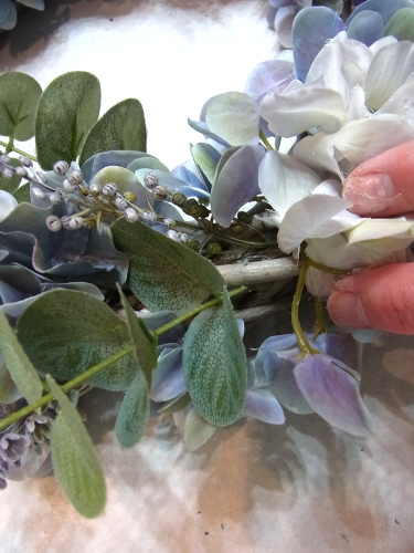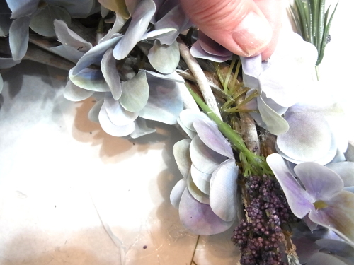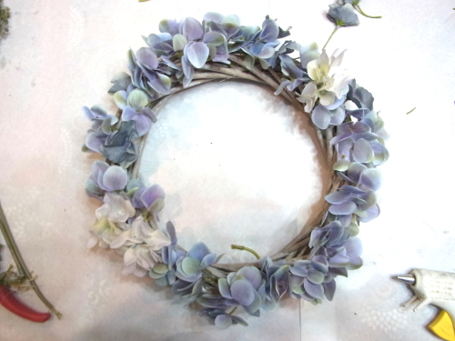 この一本分は全部 リースの正面に使います。グルーで貼っていきましょう 挿すというより、溝に寝かせて添わせる そんなイメージです。 均等についたら、さらに間をうめていきます。 色違いの濃いアジサイや白いアジサイもカットして正面にトッピングしましょう