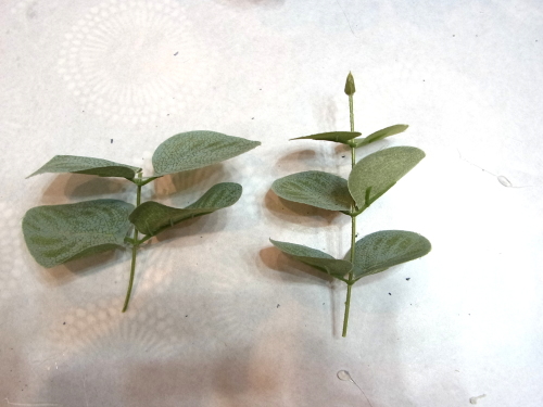 ユーカリは長いまま使えばダイナミックなデザインになりますし、写真のように上下にわけてもOKです こちらは、私の好みで さらに下の方の双葉のようにカットしたものです。