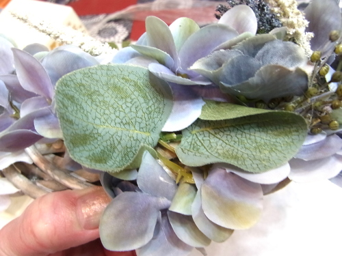 (2) 残るアジサイ1本の1/2は一番先の枝分かれの手前でカット。内側につけます。内側はリースベース素地を見える部分もつくりましょう。