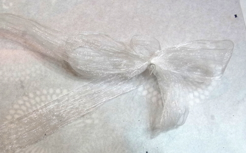 上がきまったら、フックを付け、上下がしっかりきめて、リボンをとめます。