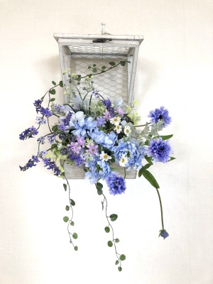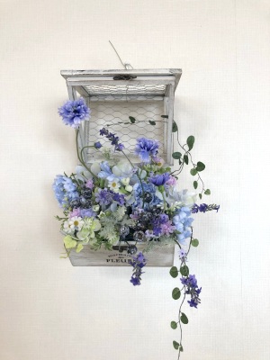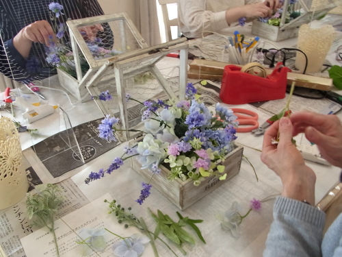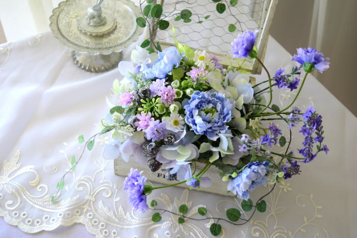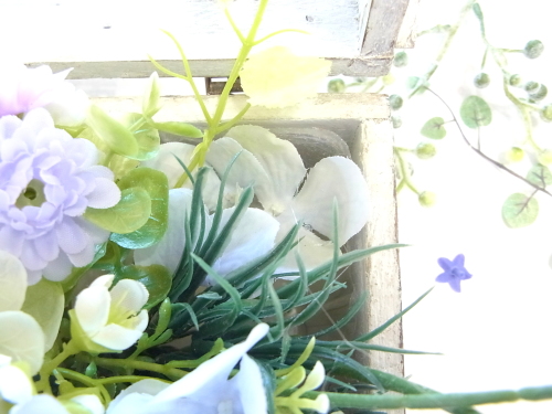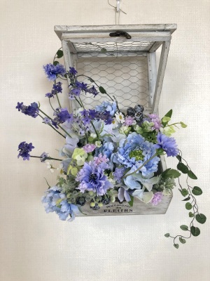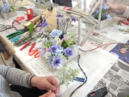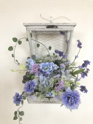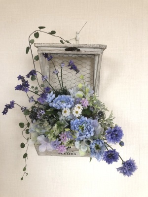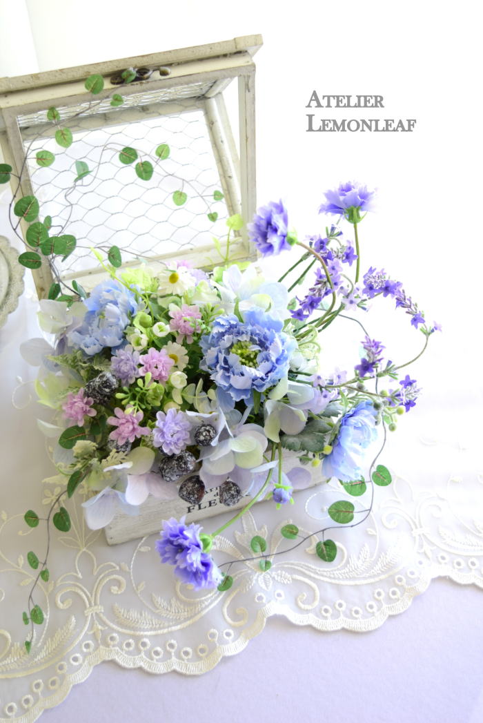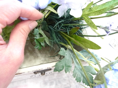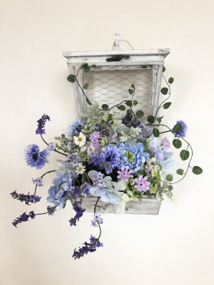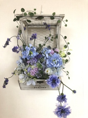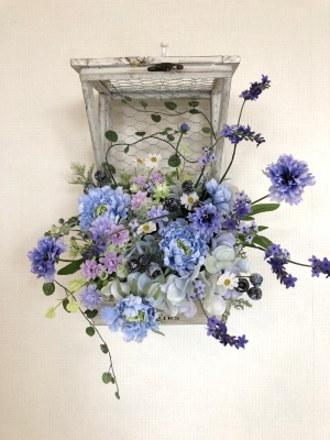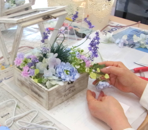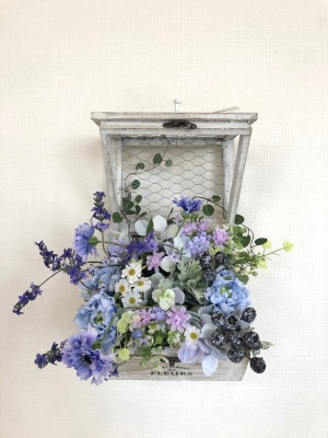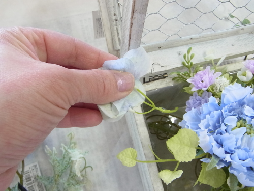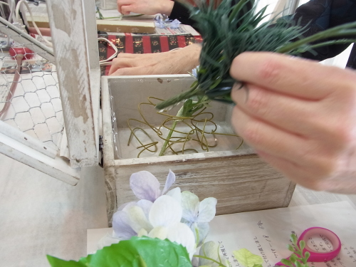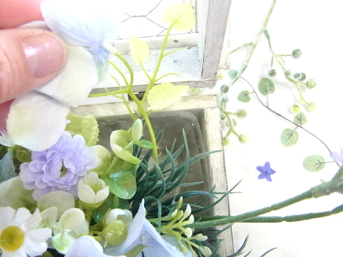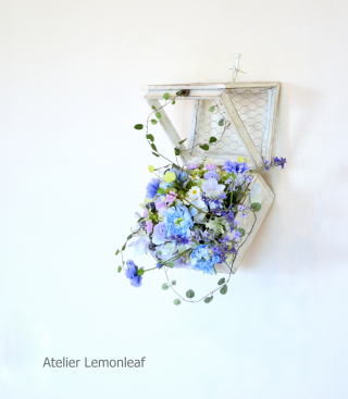 | 最後にツルを入れ込み、好きなようにはわせて完成です。 ツルはフタのほうにのばすと、お花の向こう側にみえて、奥行きを感じさせてくれます。 |