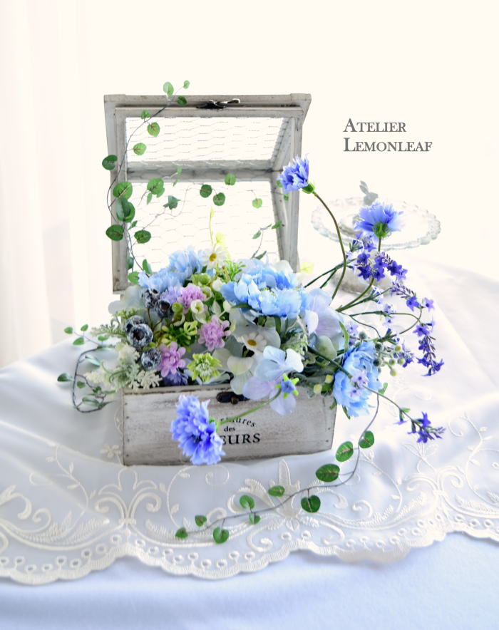 | 実(ユーカリ)はまとめてそのまま使ってもよいです たわわに箱からこぼれるようなデザインも素敵です。 あるいは、小分けにして、ワイヤリング、あるいは、、小さくカットして、グルーでのせてもOKです。 。 |