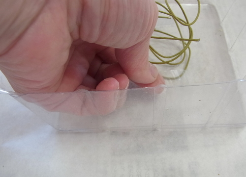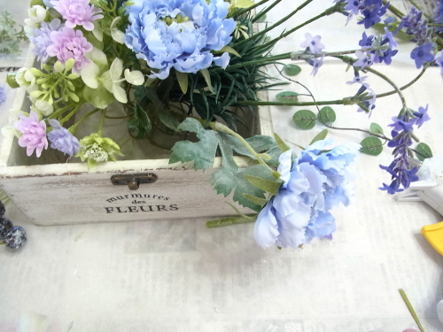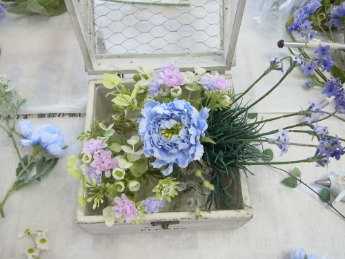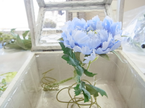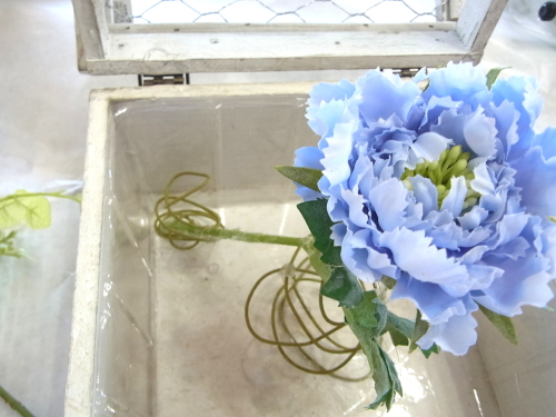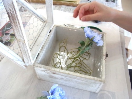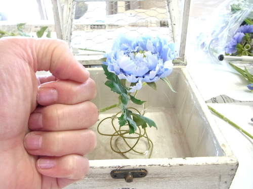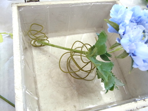 | スカビオサを出したいところにセット、コイルとグルーをコイルと花材の接点に注入してとめます。 高さは箱の淵よりも数センチ上にでるくらいです。 |