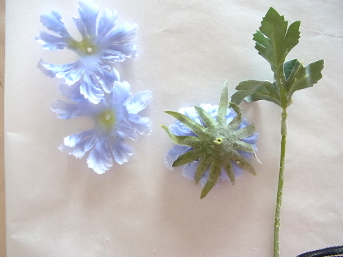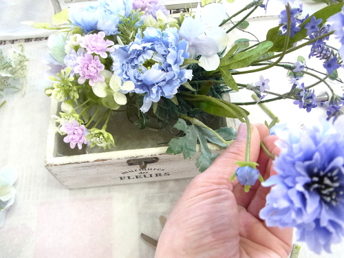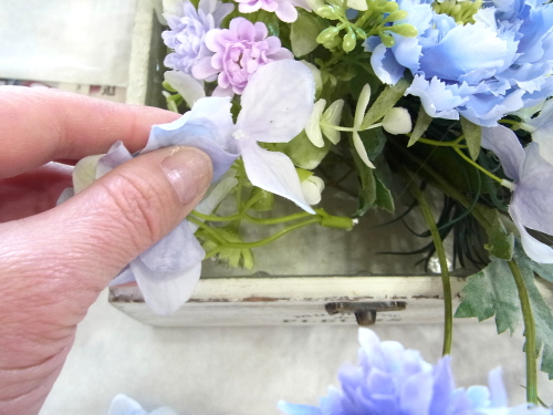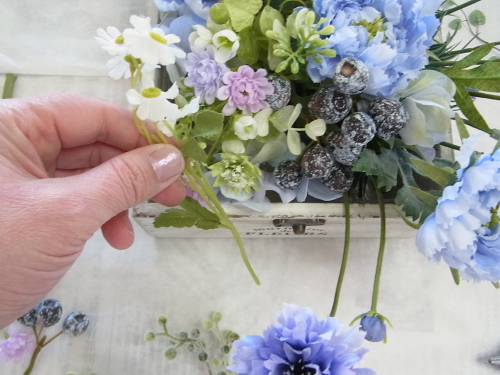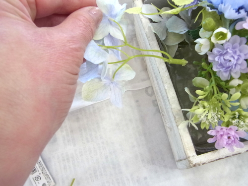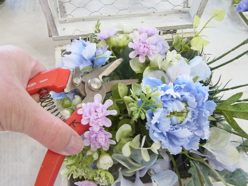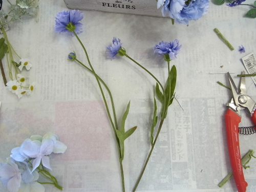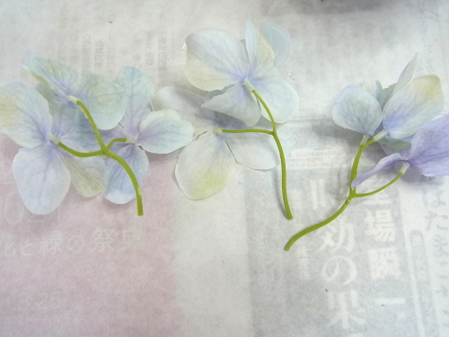 | 紫陽花も追加しましょう。紫陽花も3点とも、太い茎からキャップをとります。 ひと房が大きいので、すこし切り分けて軽くします。 |