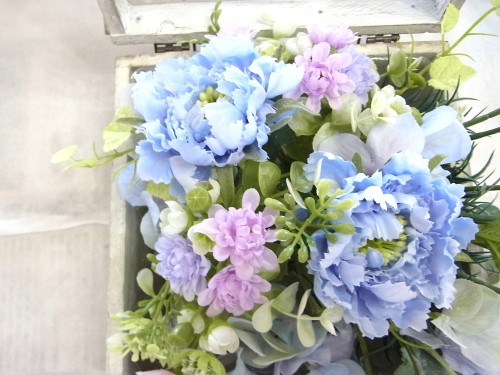 | 全部メインが同じ大きさではなく、小ぶりのおはなもあることで、大きな花は目立ち、小さなお花は可愛らしく見えます。 ボックスに強弱のリズムが生まれます |
