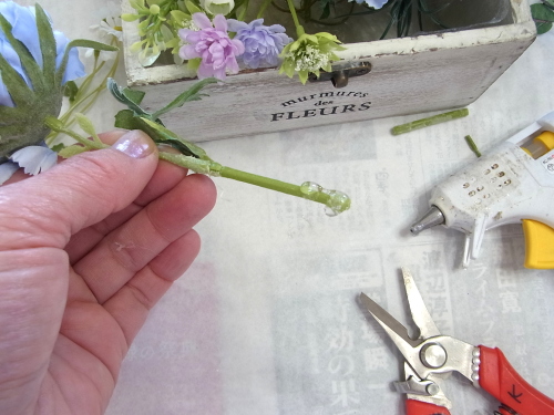 | グルーを、長く面につけて箱の中にとめてみましょう。 箱の外に出すスカビオサのレイアウトはもっと花材が入ってからにします。 ポイント グルーは花材お切り口だけでなく、広い範囲に面でつけるとよくつきます |