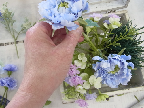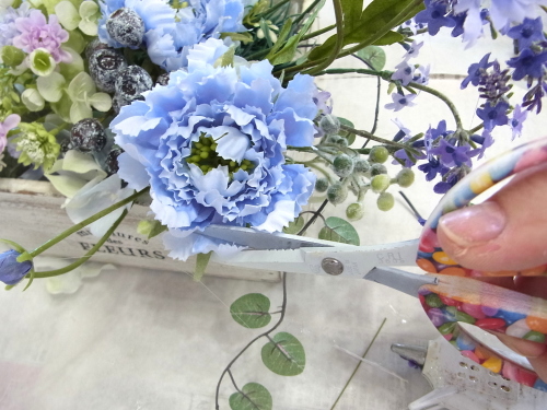 | ここからは仕上げです。 ボックスをよくみて、もぐってるミニフラワーのお花を救出します。ヘッドをカット。 よくみると緑の可愛い子もいますよ。コチラも潜っていたら、カット、 あるいは、同じ色が同じように並んでいるところもカットします。 |