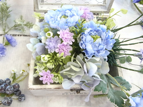 | ピンクと紫の小花2束と かるくした紫陽花3房をいれます。これでほとんど背景がうまり雰囲気ができます。 次に二つ目のスカビオサをいれます ポイント ボックスアレンジは雰囲気づくりをしながら、そうすると、メインのレイアウトの場所も見当がつきやすくなります。 |