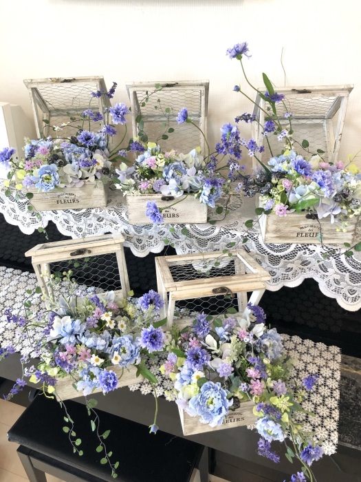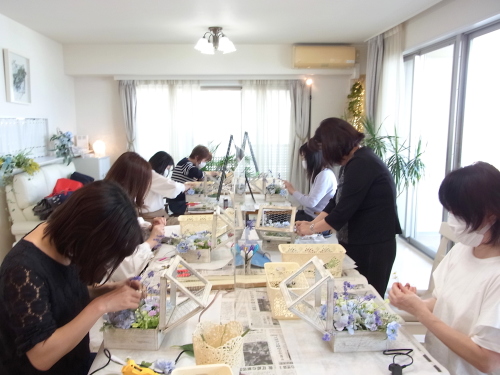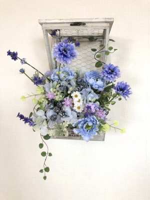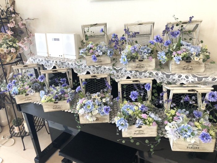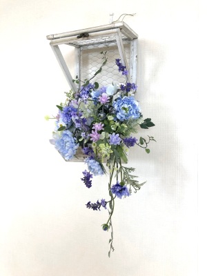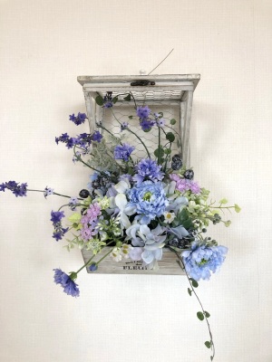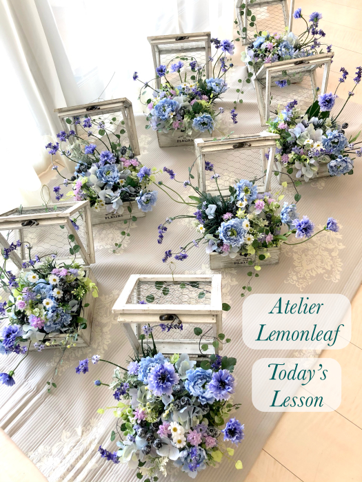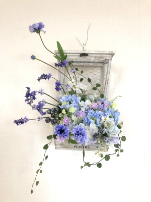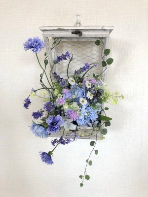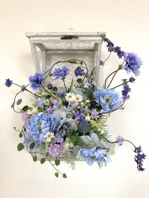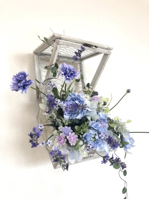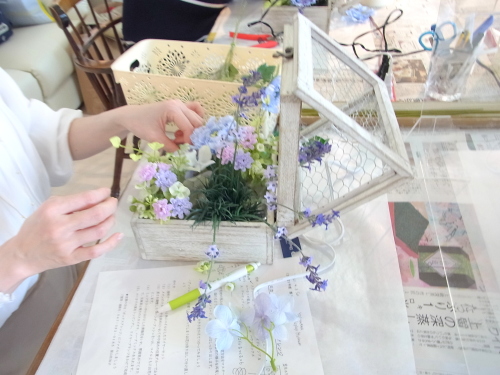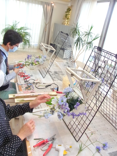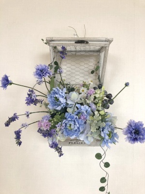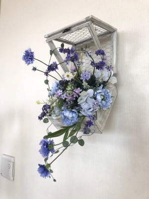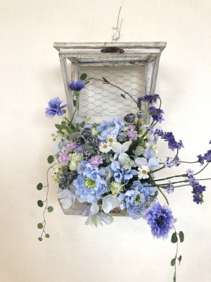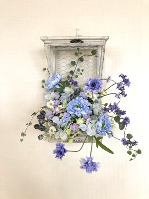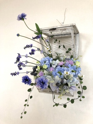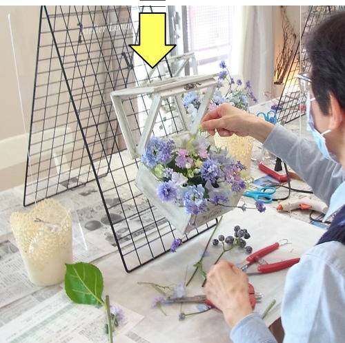 | つぎに、矢車草を適宜カットして、好きな場所にいれます。場所はラベンダーの位置と同じで、うごきの有るコーナーとしてまとめても良いですし、 ラベンダーからの流れで、L字やS字など好きなシルエットを描いても素敵です。 ぜひ生徒さんの作品写真も参考になさってくださいね! |
