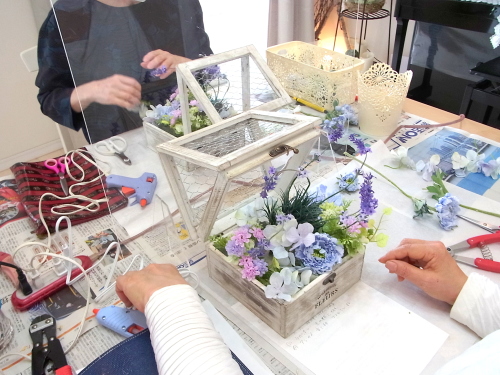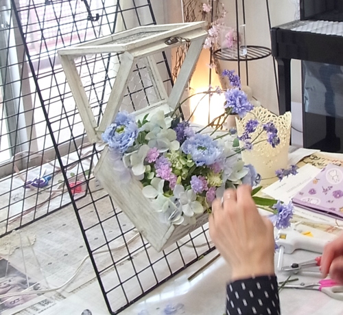 | ラベンダーの位置がきまったら、周りの雰囲気作りをしましょう ミニフラワー小花(ピンクと紫)を茎はそのままで、いれてみます、2輪あるので、対角などに配置します 高さがOKであれば、そのままグルーでとめます。 |