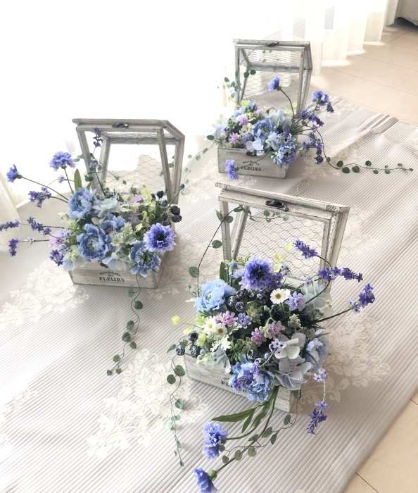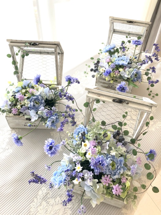 ポイント ラベンダーはあちこちむいていますが、直しす方法 アーティフィシャルフラワーの構造から、花はすべてキャップになって茎にささっています。 よくみるとわかるので、そっと、抜いて挿しなおすと、カーブが変わります。 あるいは、根本のほうには、ワイヤーがはいっているので、奥でカット、グルーでさしなおしてもOKです。 |