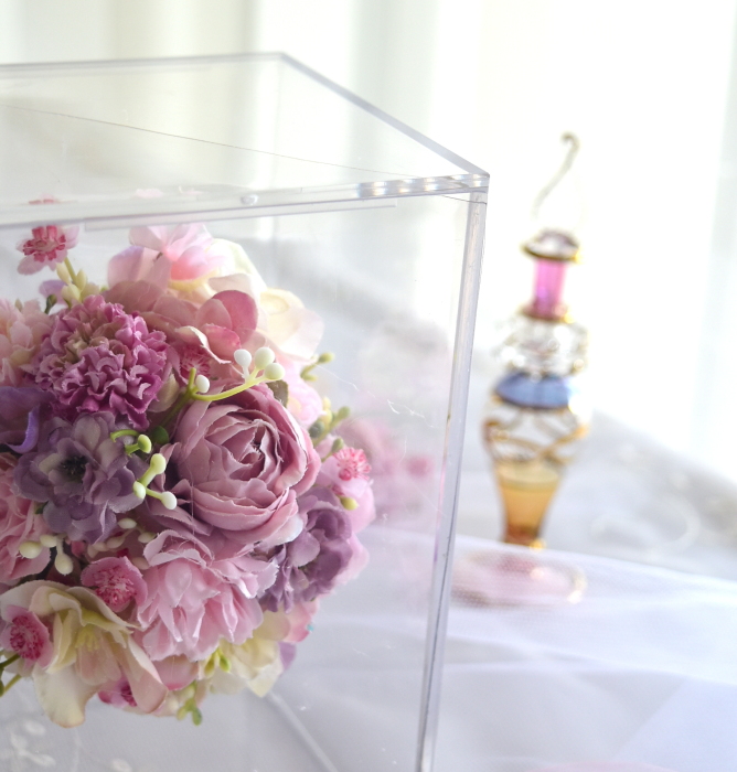 ケースを写真のように寝かして、そこに伏せておくと、お花がつぶれません。