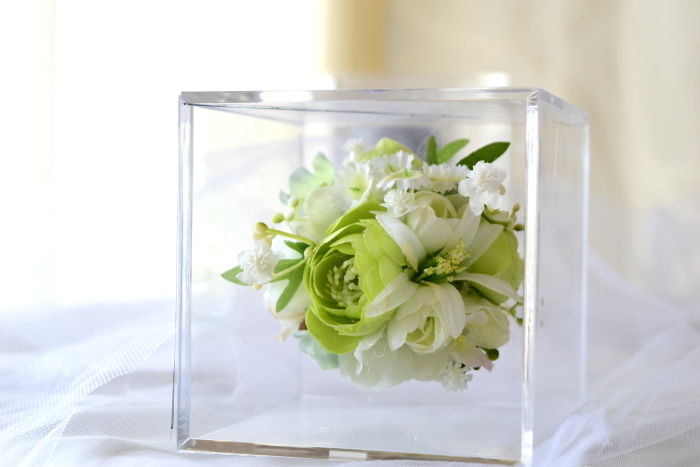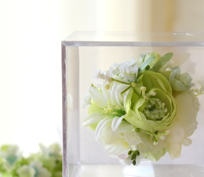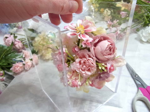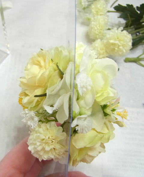 仕上げに最初にとっておいた、カスミソウなどの小花を全体にトッピングします。ケースに当たらない程度に飛び出させていれるとぐんと動きがでます。