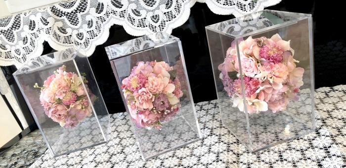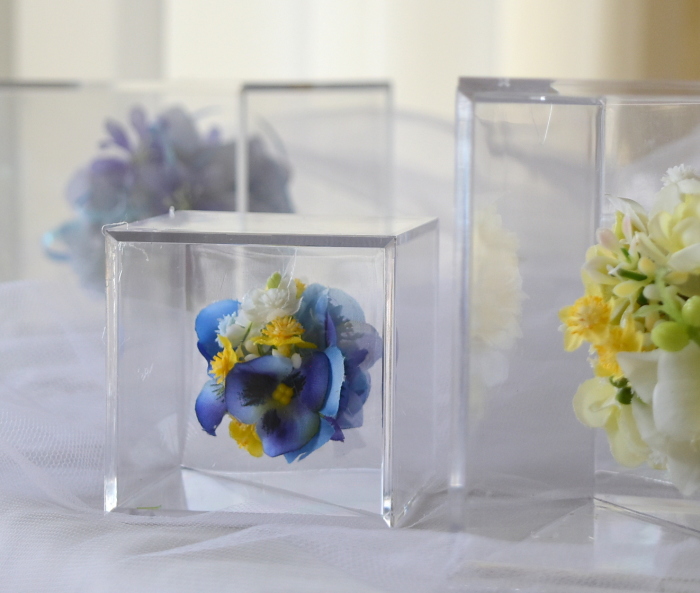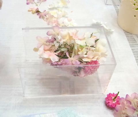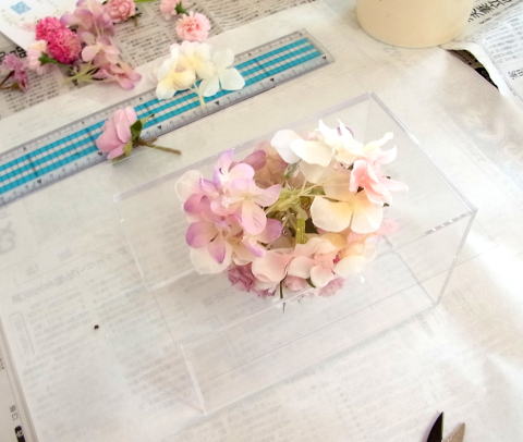 ケースにいれてみるとわかりますが、板のトップの高いところが、ケースの角にきます。板の左上、右上のお花が主役の位置です。飾った時にケースの正面にくることになります。