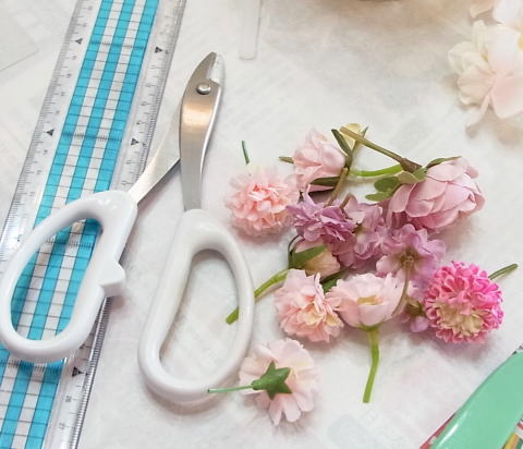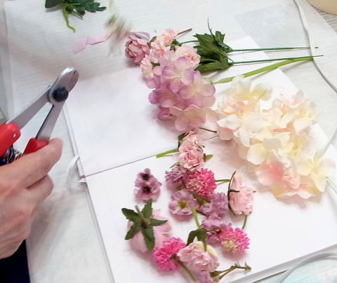 すべての花材を茎を3センチくらいにカットします。3本指でつまんで持てる程度です。 |