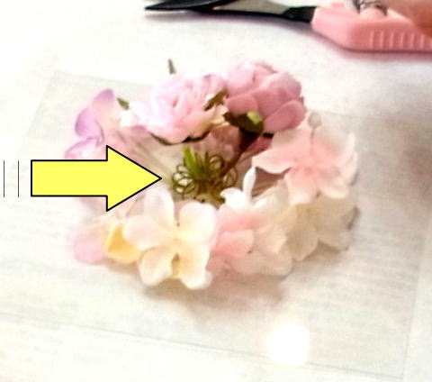 またはつけたまま お花の花びらのほうをカットして小さくします。