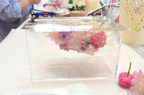 仕上げにカスミソウのような小花をトッピングします。ケースに当たらない部分には、すこし小高くいれて動きをだします。