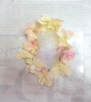 とっておいた1輪の紫陽花や、残り小花で、ラインを足したり、大きな穴が開いていたら その1枚でを張れば隠すことができます