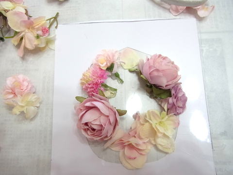 は透明のプレートをお花で、サンドイッチするだけ♪、至ってシンプルです!(^^)! 形は正確な丸になる必要はありません、浮いて見えることがポイントです。