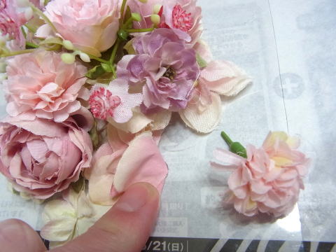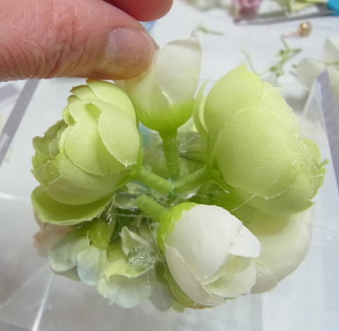 上記で小分けにした紫陽花のうちさらに、一輪づつにしたものを 10個つくっておきましょう、