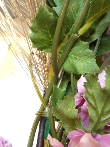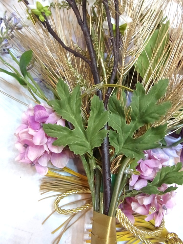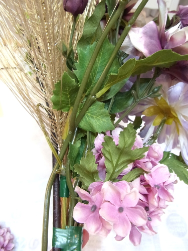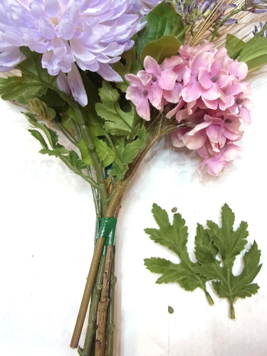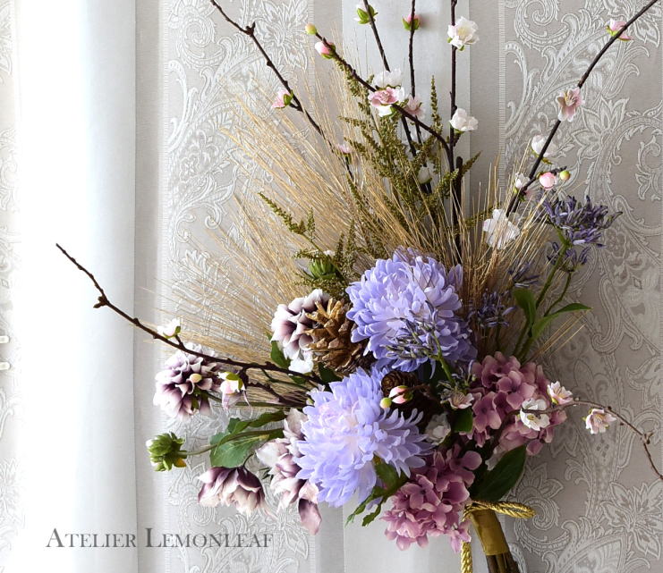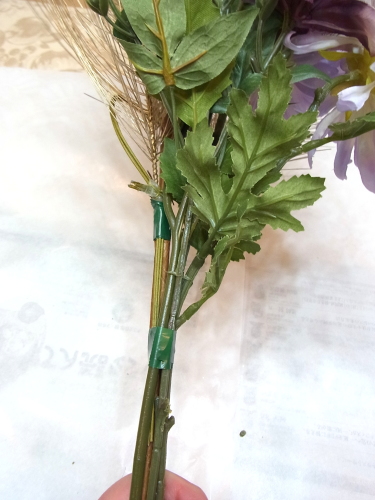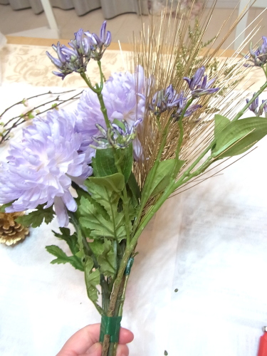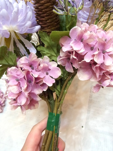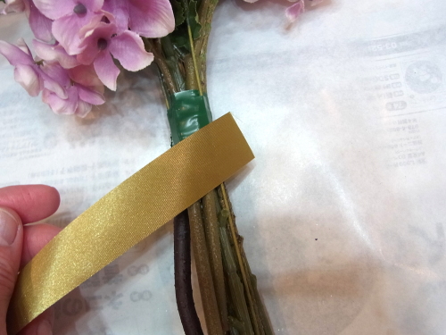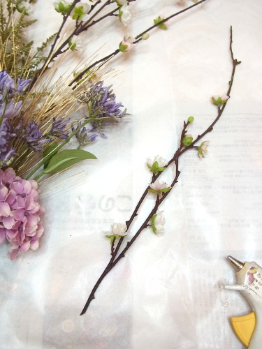 桃の枝とアジサイ以外、すべてのお花も好きな位置にレイアウトし、1~2本づつテープでまきとめます。