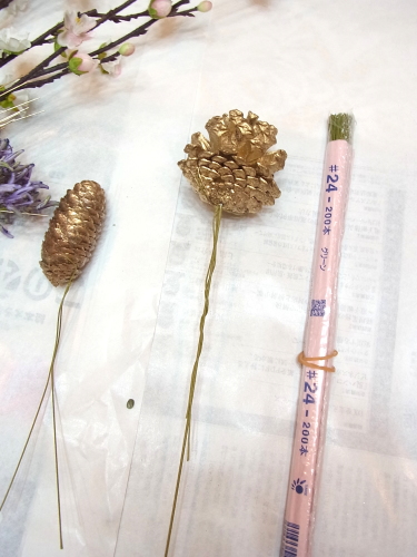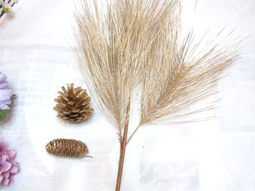 (2) ゴールドパインコーンをアシストにくぐらせて固定。松の実はピックにておきす。アジサイ以外のお花を好きな位置にそえてテープで止めます。背面に入れたい花材はアシストをくぐらせると安定します。