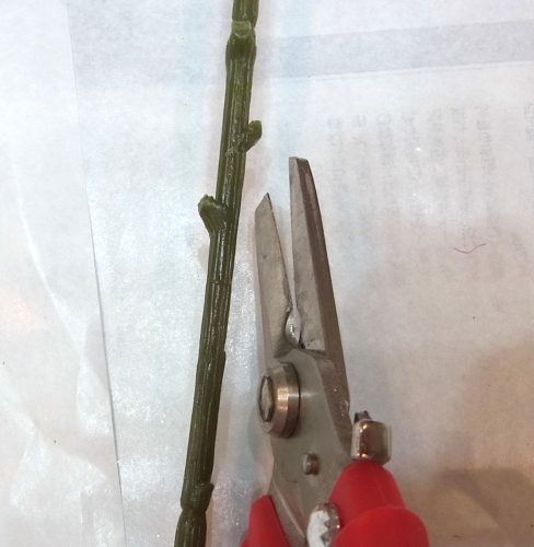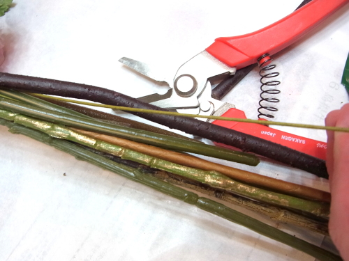 下まで巻く必要はありません、フローラルテープがあると、むしろビニールテープやグルーがつきずらくなります。好きな位置に実をいれこみ、アシストをくぐらせたほうが安定する場合は通してください。テープで巻きます。 ここから枝の調整をしますが、もし茎が長すぎて作業しずらいときは 以下を参考にして、先に持ち手の茎の部分を処理してからでもOKです