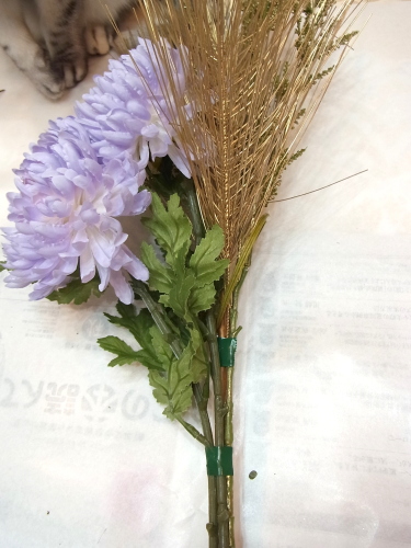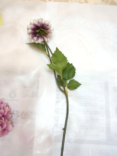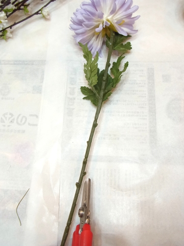 マムの色は薄紫色の濃淡のものになります。まれに中央がピンクになっているようにみえますが、これは着色時の個体差による、色の出方の範疇として、ご了承くださいませ。とっておいた実にやわらかい方のワイヤーをかけます。