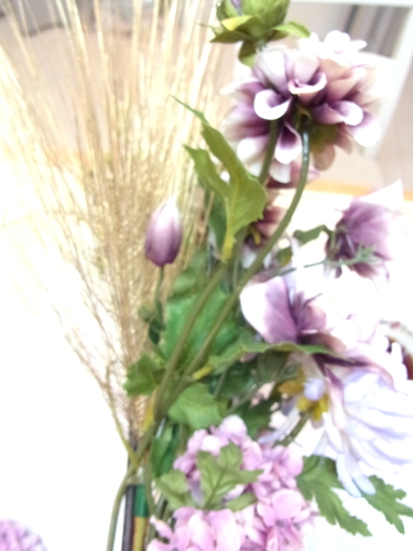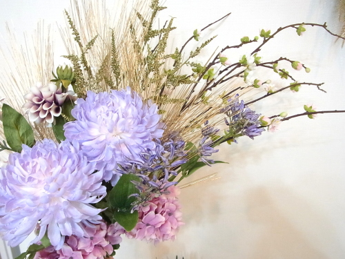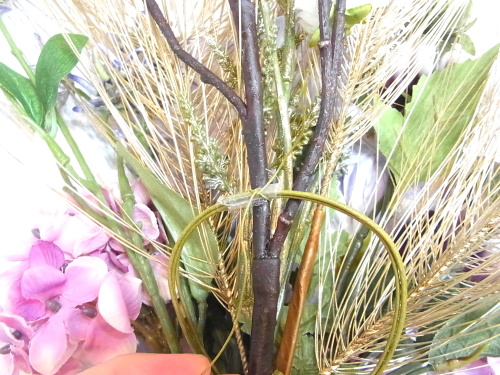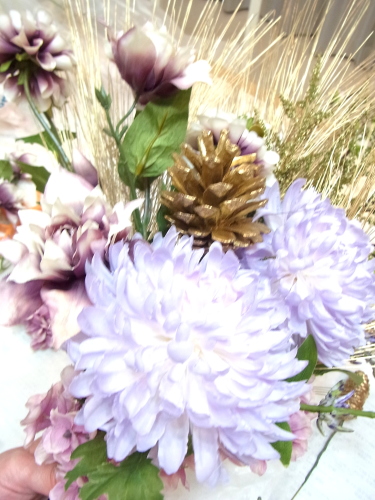 花材:マム(菊) A ダリア A クレマチスA、アスチルベA ナナコバナA アジサイ A ゴールドパインコーンA タッセル A 桃 A