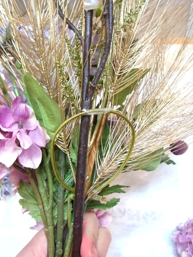 このとき、前面にくるお花はそのまま添えてOKですが、、脇や背面に添えたいときは アシストの輪に茎を通すと、バックが支えられ、好きな位置で固定できます。