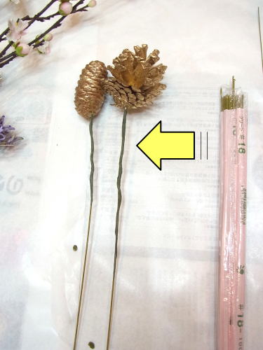 入れる枝の場所を迷ったら、不等辺三角形を意識してレイアウトすると綺麗になります。ぐっと立体的に前方向にでるようにいれます。茎処理をします。松の実をつけたワイヤーはできるだけ奥で見えない用意カットします。 ビニールテープをリボンで隠します 好みの長さに茎をカットします アーティフィシャルフラワーの茎には溝がついており、ここでカットすると切りやすいです。