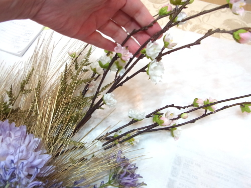 全部花材がはいったところから、桃の枝を最終調整します。