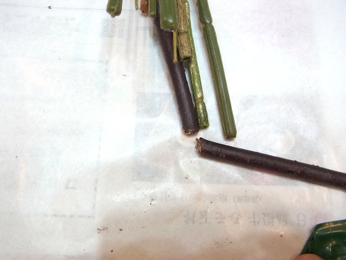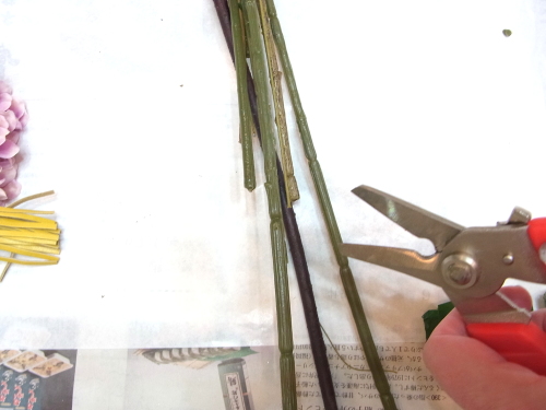 桃の枝は、まず、外側の茎のビニールをハサミで切り目をつけます、ワイヤーにつきあたったところで、ペンチをつかいましょう