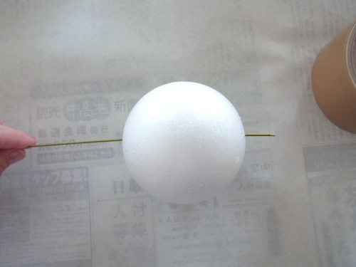 写真のようにガムテープなどの上において安定あせて、まっすぐに太い方のワイヤーを貫通させます。 |