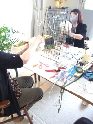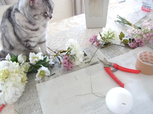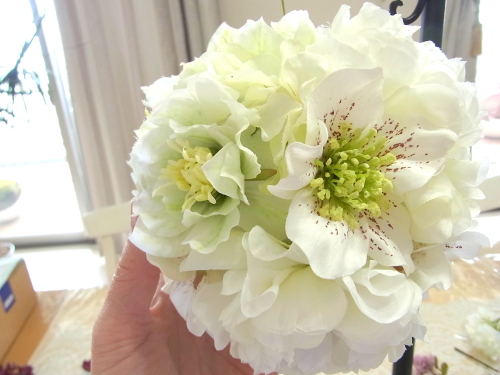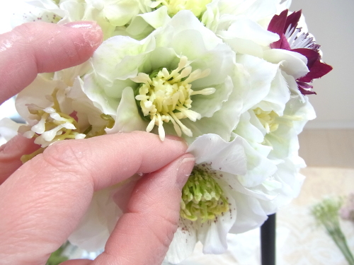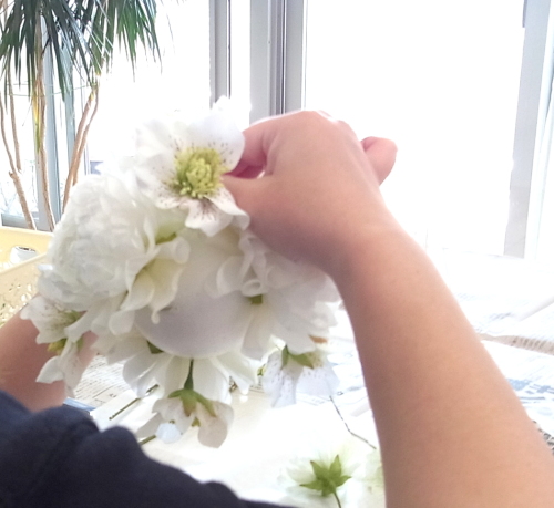 クリスマスローズが気持ちよく開いているかチェックしながらつくります。 |