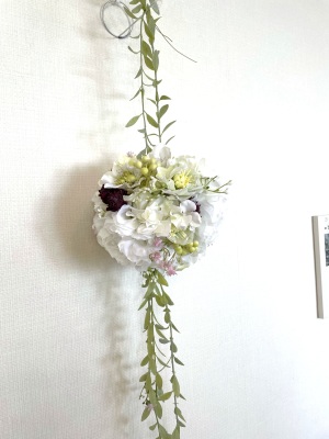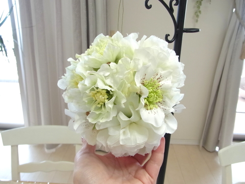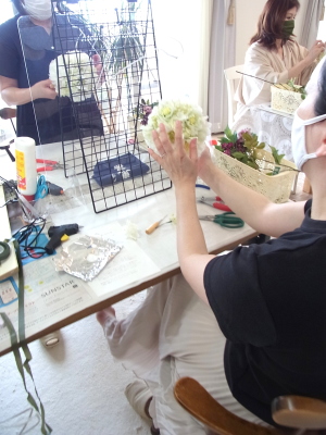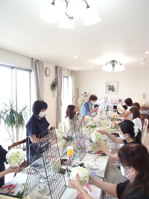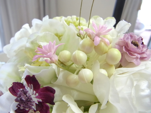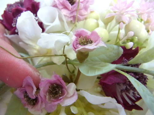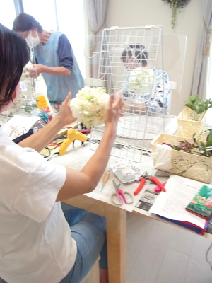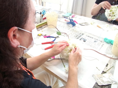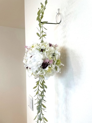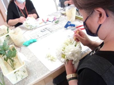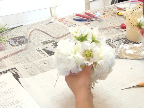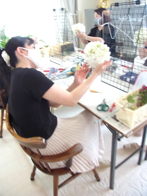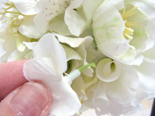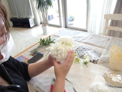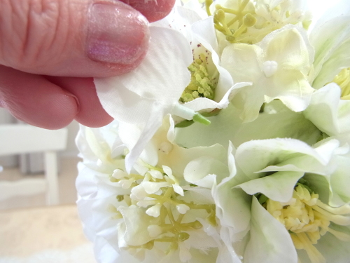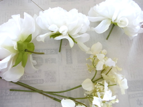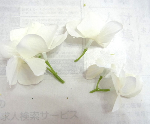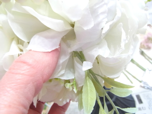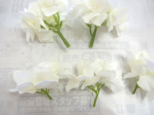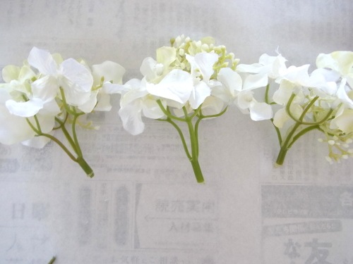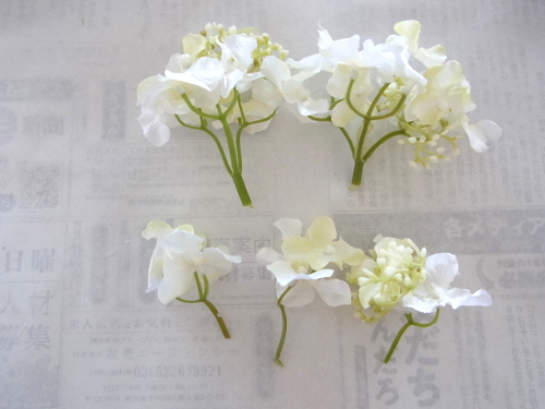 さらに空いているスペースを白いアジサイでうめていきます、小分けにしましょう